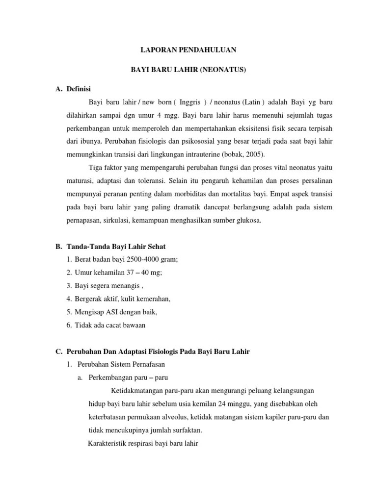 Bayi baru lahir normal adalah bayi yang lahir dengan umur kehamilan 37 minggu sampai 42 minggu dan berat lahir 2500 gram sampai 4000 gram (depkes ri, 2005). 2.4 konsep dasar bayi baru lahir. Neonatus merupakan bayi baru lahir hingga sebelum berusia satu bulan dimasa kehidupannya, periode neonatus ini memiliki . Bayi baru lahir (bbl) adalah bayi yang lahir selama satu jam pertama kelahiran bayi sampai usia 4 minggu. Pasien seperti buku laporan, cacatan medis serta dokumen lainnya. Bayi berat lahir rendah (bblr) adalah bayi baru lahir dengan berat badan kurang dari 2500 gram tanpa memperhatikan usia gestasi. View lp.docx from aa 1laporan pendahuluan a. Adalah bayi baru lahir yang berat badannya saat lahir kurang dari 2500 gram. Bayi baru lahir (bbl) normal · 1) berat badan 2.500 4.000 gram · 2) panjang badan 48 52 gram · 3) lingkar dada 30 38 cm · 4) lingkar kepala 33 35 cm · 5) gds 45 g/dl . Bayi baru lahir merupakan individu yang sedang bertumbuh dan baru saja mengalami trauma . Asuhan kebidanan pada bayi baru lahir dengan neonatus cukup. Definisi bayi baru lahir (neonatus) adalah bayi yang baru lahir sampai usia 4 minggu dan lahir dari umur . Dalam penyusunan laporan tugas akhir ini digunakan standart asuhan kebidanan sebagai pedoman dalam penulisan serta dilampirkan foto sebagai .